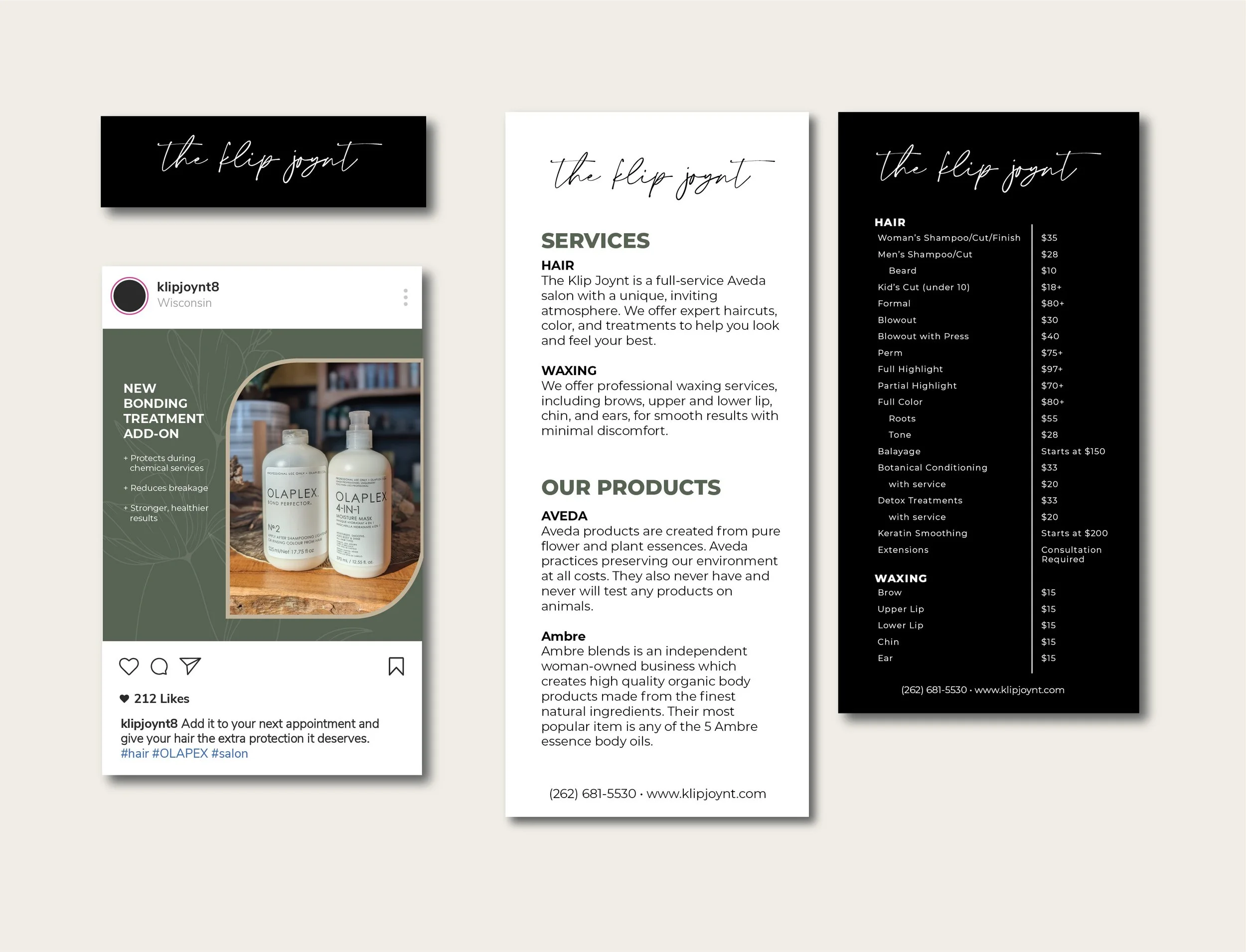 Created the logo and a set of marketing materials for this salon, including menus and social media graphics. Focused on a clean, modern look with consistent typography and layout.